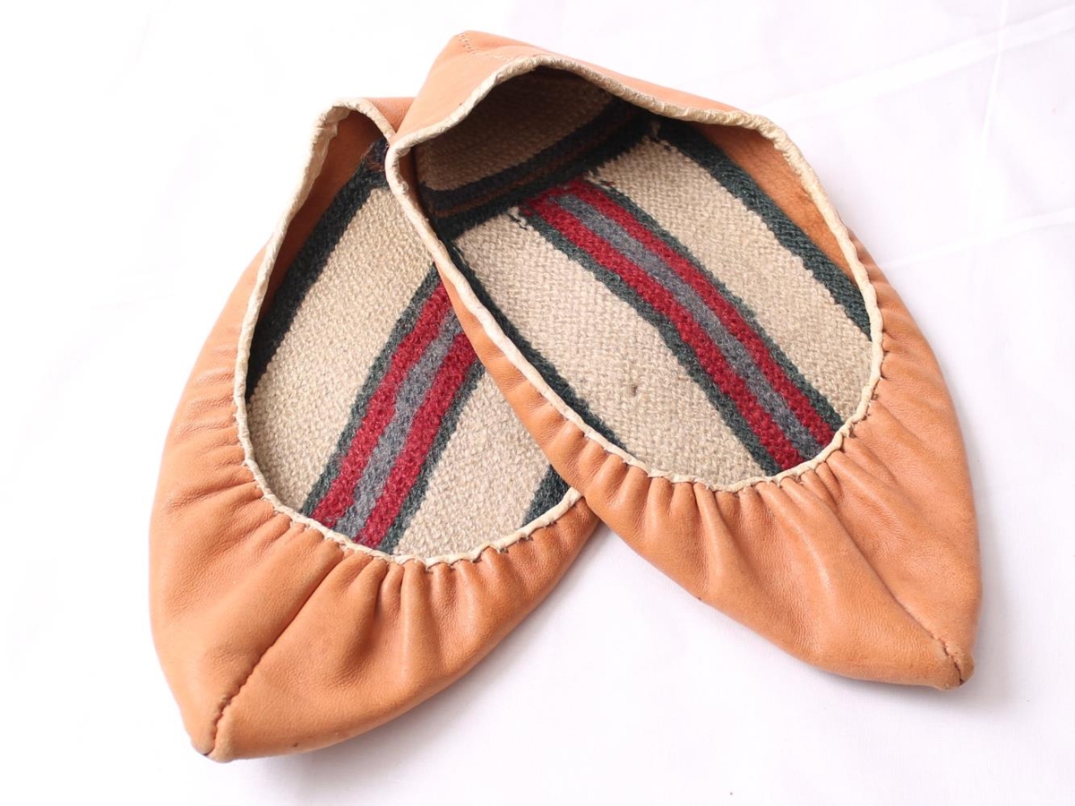 Skinnskór frá Haraldi Bjarnasyni (1874-1964) á Álftanesi, gerðir af honum sjálfum í kringum 1955-56 og notaðir sem inniskór. Handsaumaðir úr ljósu leðri. Ásgeir Ásgeirsson gaf safninu skóna ásamt kompási sem var í eigu Páls Stefánssonar (1907).