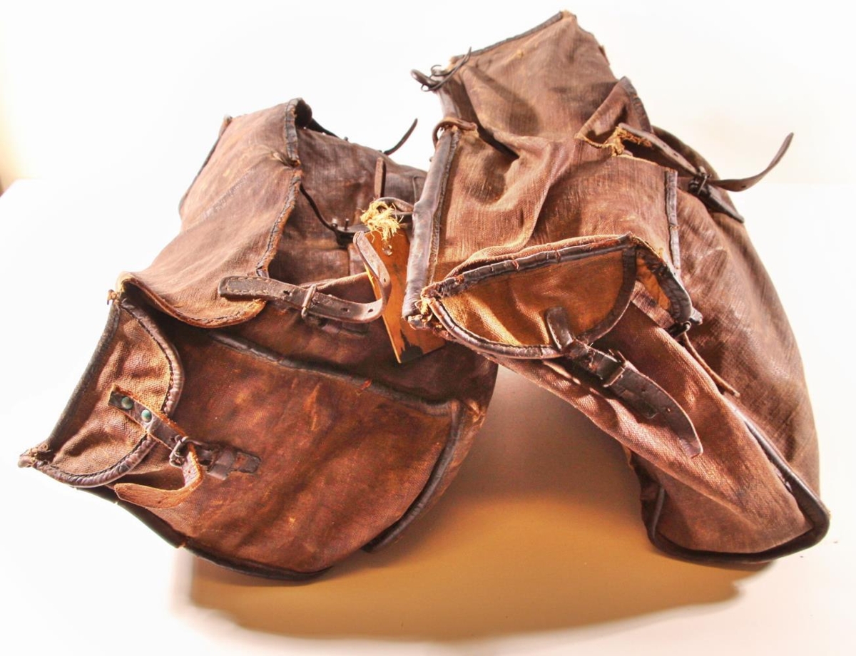Klyftöskur úr brúnu leðri. Allar saman verptar. Lokaðar með þremur hringjum að framan (tveir eru farnar af annarri töskunni) og einnig er hringja á hvorum enda. Reim utanyfir allt og gjörð (mótaka með hringju) til að binda saman yfir hrygg hestsins. Lykkjur úr járni.