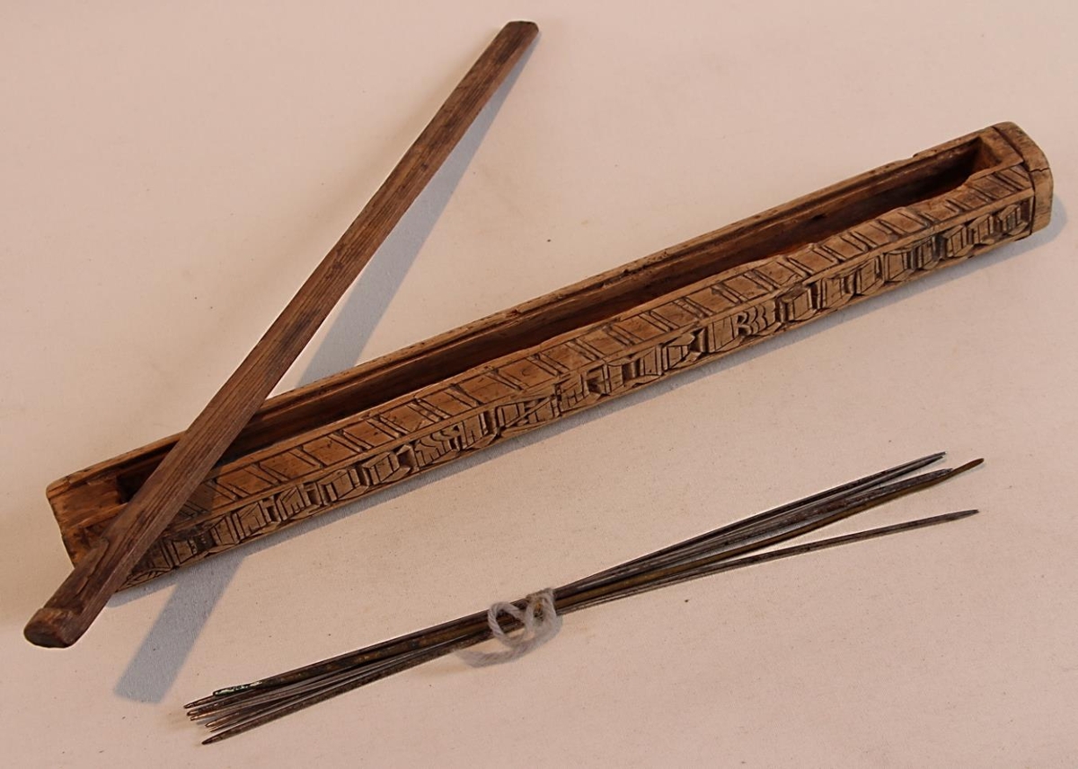 Prjónastokkur úr furu eða birki, spreki, holað að innan. Átthyrndur. Dýpt: 2 cm. Breidd: 1,5 cm. Glæsilegt skorið letur er á stokknum, þar stendur „Ragnhildur Þorgeirs" öðru megin en á hliðinni á móti stendur „Dóttir Á stockiNN Ui". Botninn er gróflega sprunginn, nánast eftir endilöngu. Lokið sem fylgir stokknum er ekki upprunalegt, úr annars konar viði, örlítið kúpt að ofan. Ofan í stokknum eru nokkrir prjónar af ýmsum stærðum og gerðum, 13 stk.