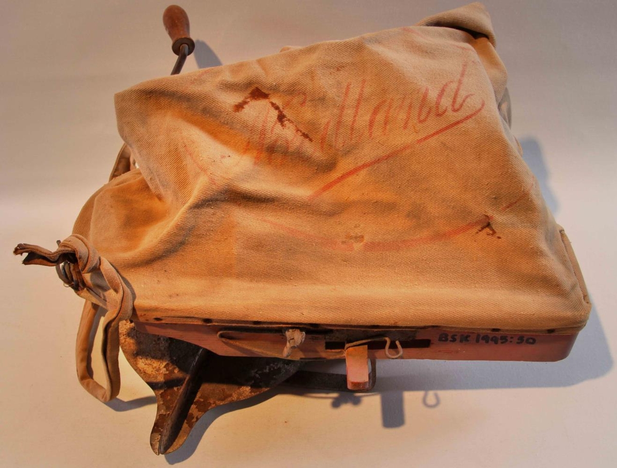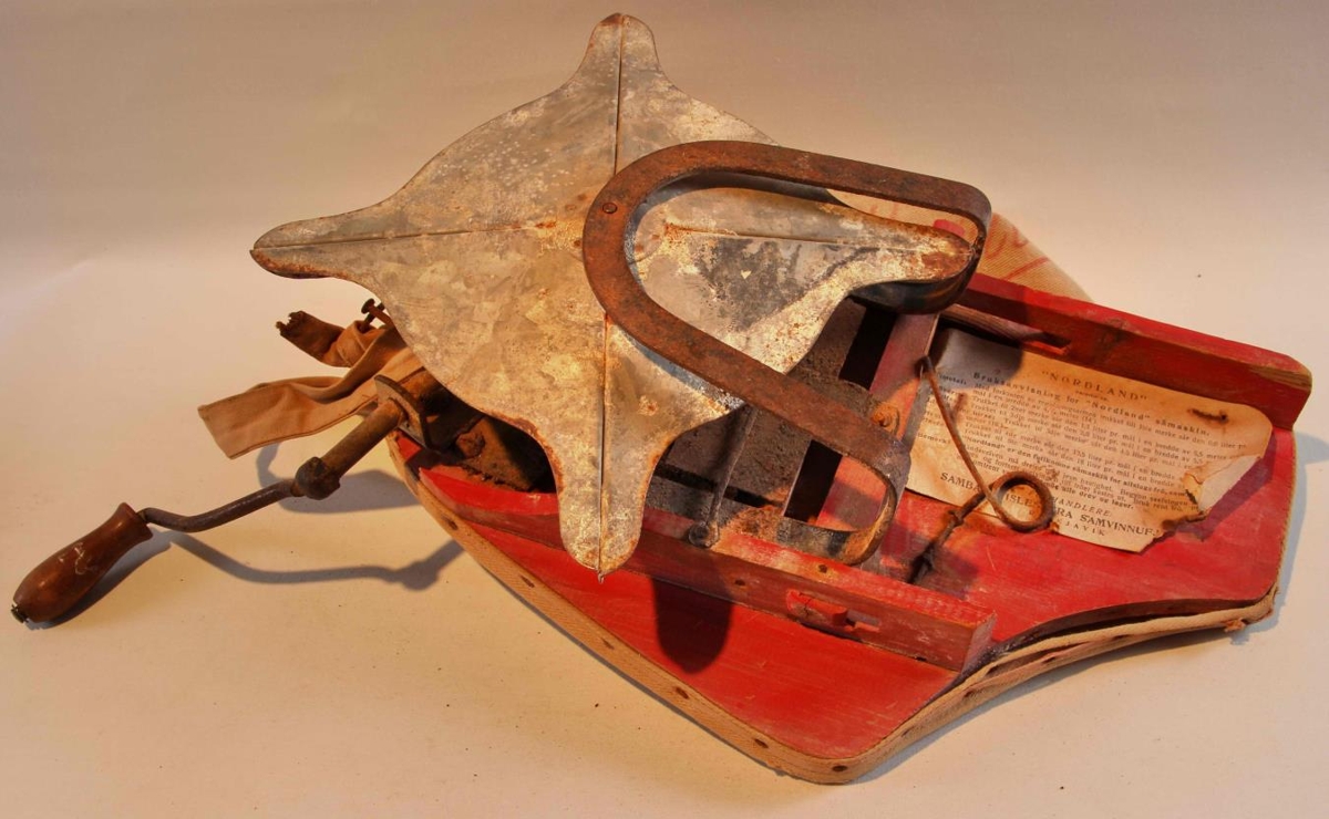 Sáðvél úr járni og furu (sjálft gangverkið) en pokinn undir fræin er úr segli. 36 x 16 cm að stærð. Á honum stendur Norland. Tréverk er rauðmálað. Pokinn er negldur á, 32 cm hár. Botninn á pokanum er tréverk með spaða sem snúið er af handfangi og við það þeytir vélin fræinu. Allt úthaldið hangir í axlafatta.