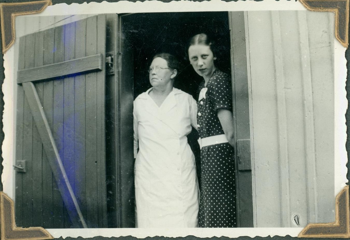 Tvær konur í dyragætt. Við myndina er skrifað: Jakobína + Unnur.