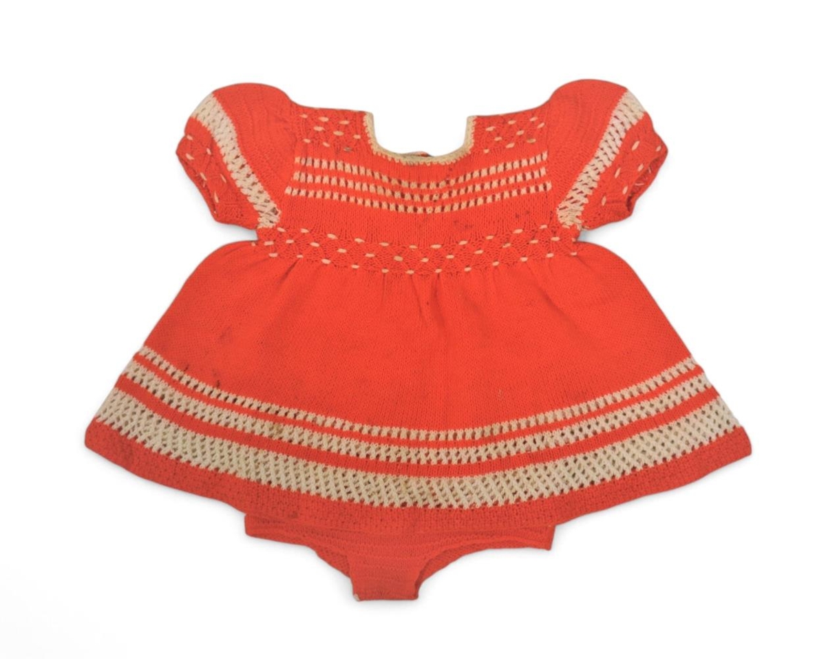 Prjónaður kjóll ásamt undirbuxum á ungt barn. Sídd á kjól 37 cm. Heimagert.