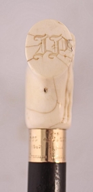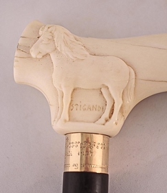 Göngustafur Jóns Péturssonar bónda Nautabúi og Eyhildarholti. Á stafinn er letrað nafn Jóns og 1867 3. júlí 1937. Frá dætrunum fimm og sonunum sjö á sjötugsafmælinu. Aftan á handfangi er ártalið 1937 og RJ, sem eru upphafsstafir listamannsins Ríkharðs Jónssonar sem greipti gæðinginn Stíganda á listilegan hátt í rostungstönn.