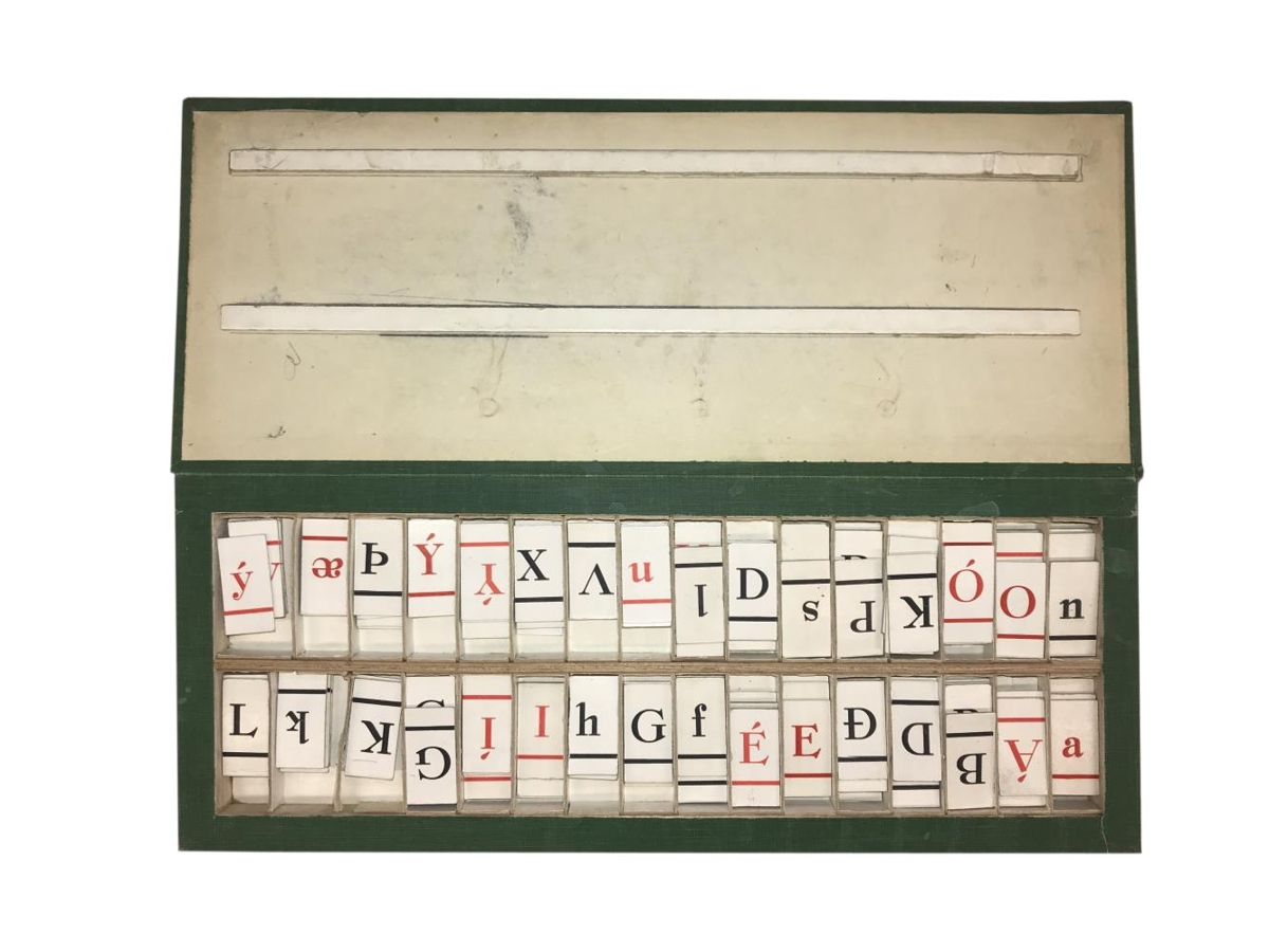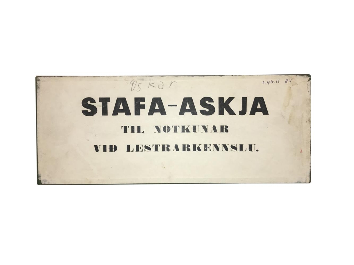 Stafa-askja, til notkunnar við lestrarkennslu. Pappa-askja með lausum spjöldum með bókstöfum. Njáll Bergþór Bjarnason, sérkennari við Barnaskólann á Húsavík átti hugmyndina og þróaði útfærslu stafaöskjunnar sem er notuð af ungum nemendum til að læra stafina, sérhljóða og samhljóða og setja saman orð. Njáll bjó sjálfur til allar öskjurnar, þær voru handgerðar og mikil vinna sem fór í hverja og eina.
