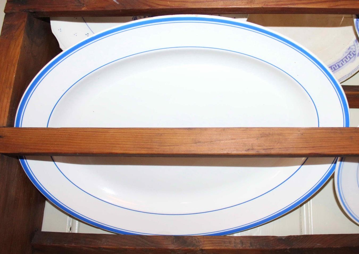 Steikarfat úr hvítum leir með þremur bláum línum á börmum. Sú á brúninni er sverust. Stærð 39,5 x 28,5 cm. Neðan á er stimplað með dökku letri: „Villeroy & Boch, Dresden, Made in Germany“. Hlíf Árnadóttir á Sjávarborg gaf safninu fatið, en það er úr búi móður hennar.