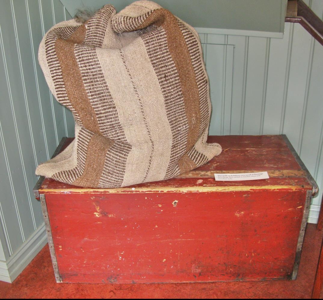 Kista, rauðmáluð kassalaga með flötu loki. Gömul, stærð 97,5 x 45 x 43 cm. Smíðuð á Hofsstöðum. Járnvarin (spengd) á köntum.