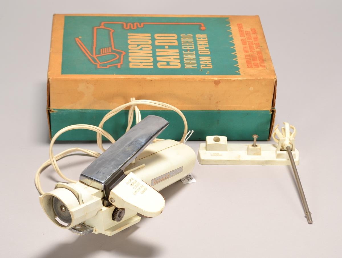 Hvítt rafmagnstæki úr plasti og málmi, dóshnífur ásamt þeytara og brýni, veggfesting og skrúfur fylgja. Allt í þar til gerðum kassa merktum „Ronson can-do portable-electric can opener complete with knife sharpener and multi-purpose beater attachment ... plus wall rack“