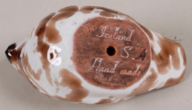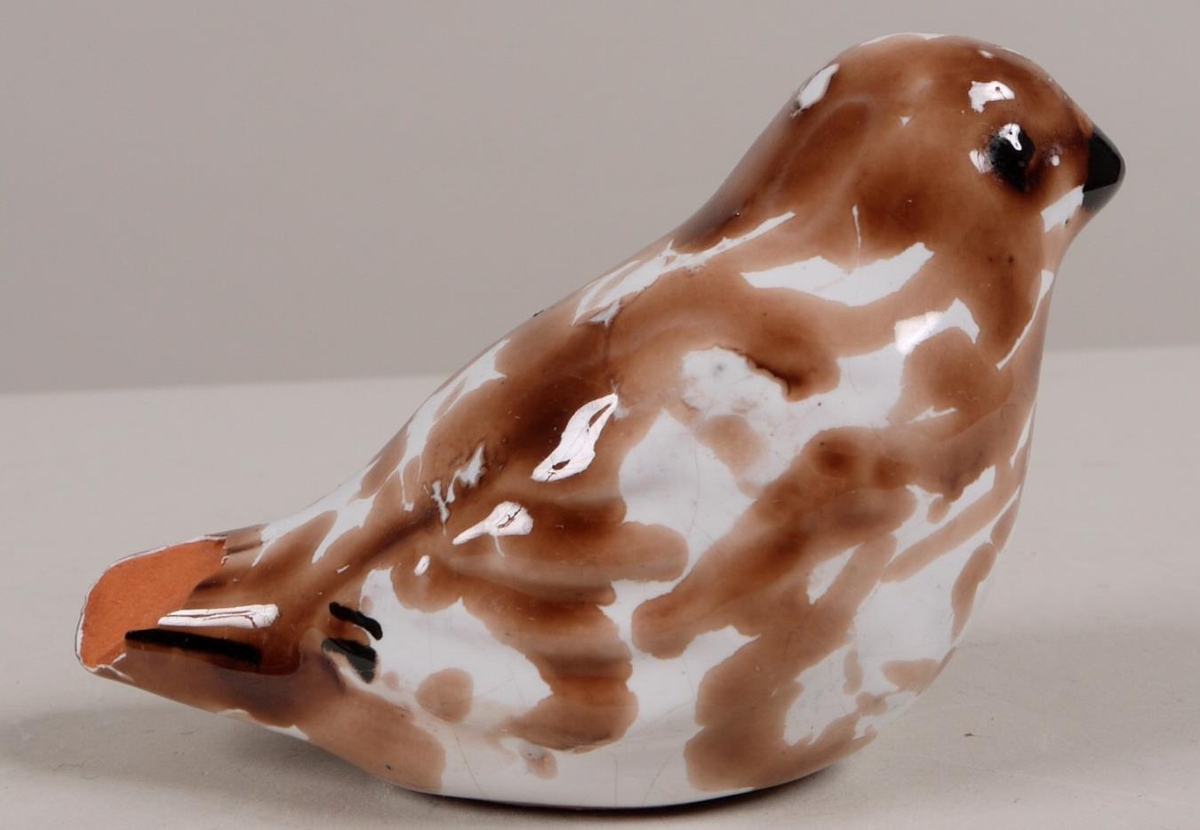 Lítil stytta af sólskríkju. Brún og hvít á litinn.