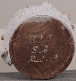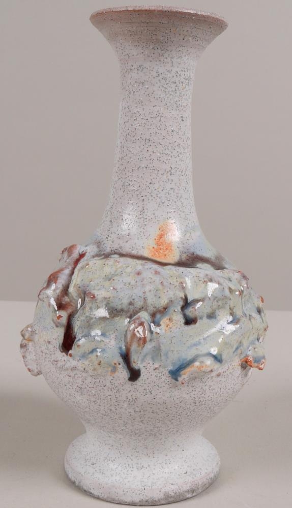Lítill blómavasi með löngum hálsi og hraunskreyti á belg. Hvítur glerungur með bláum og rauðum yrjum.