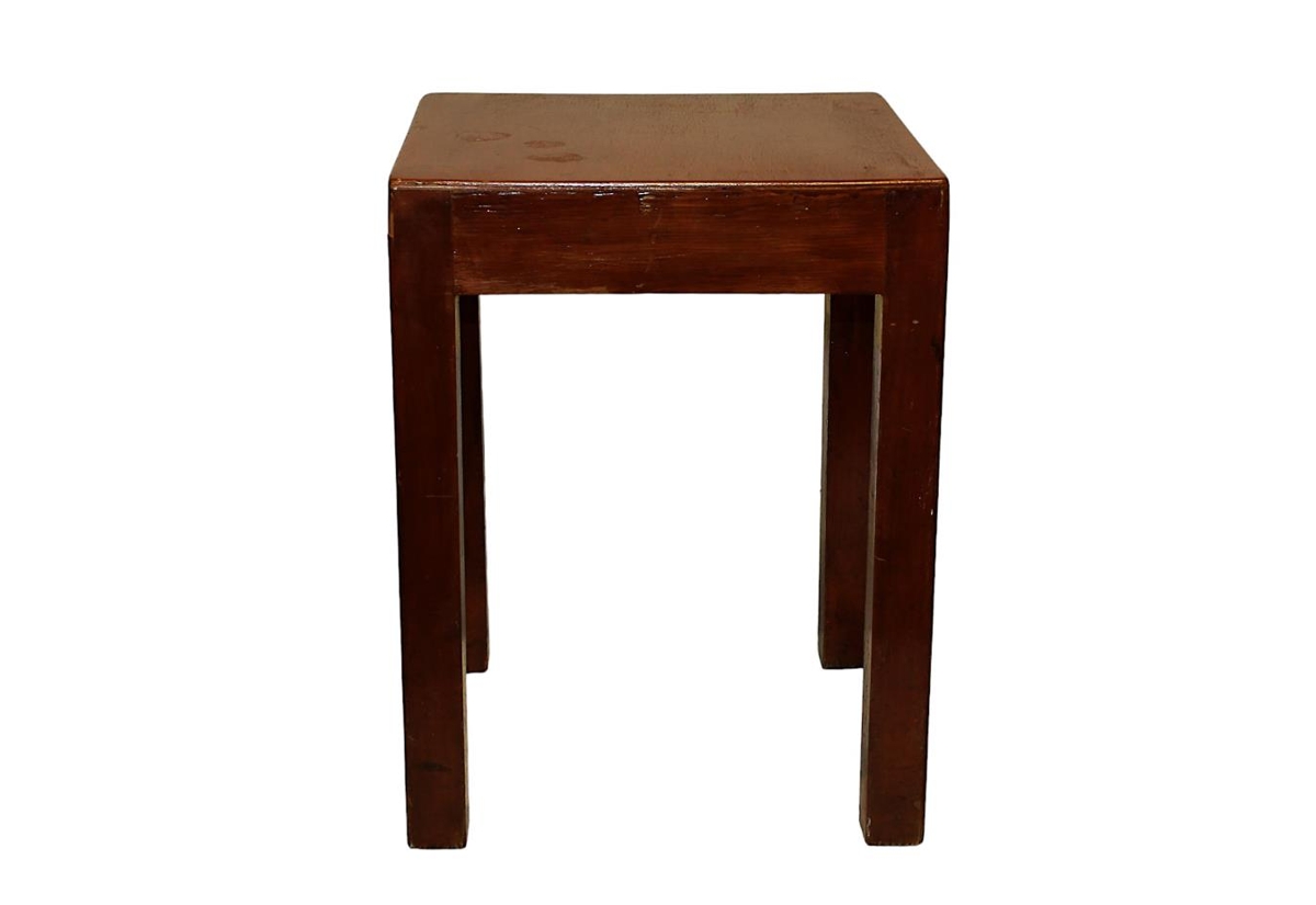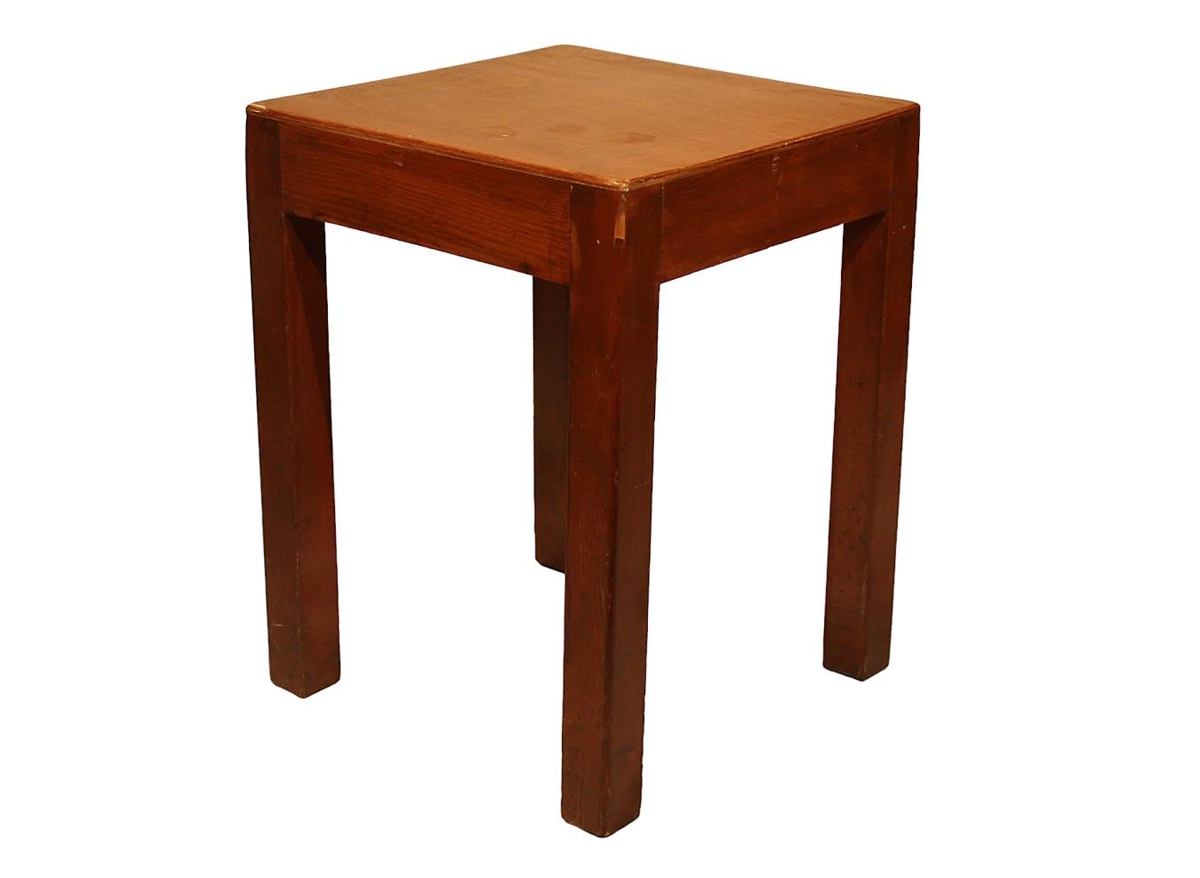 Eldhúsborð með skúffu og tveir kolla með köflóttum gólfdúk á borðplötu og öðrum kollinum