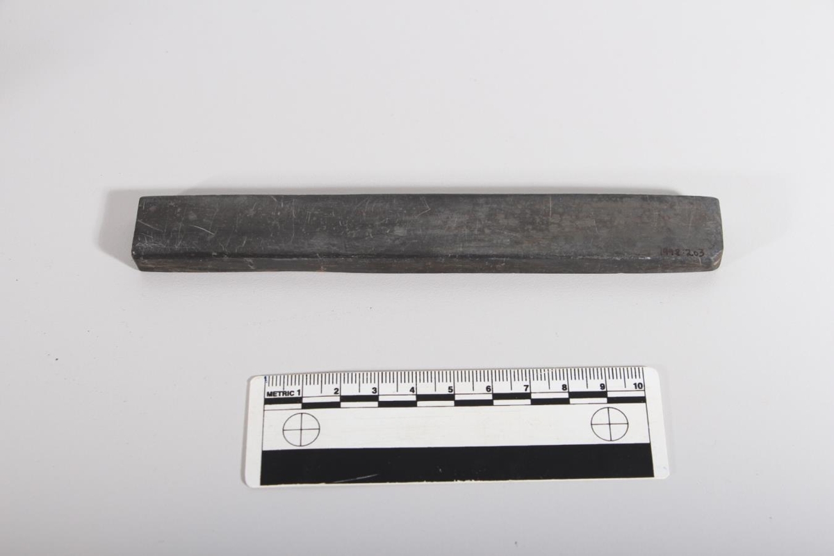 Heinarbrýni. Fylgir rakhníf nr. 1998:202. Lengd 16,2 cm, breidd 2 cm og þykkt 0,9 cm. Töluvert notað en vel með farið, úr stein. Eigandi hnífsins og notandi var Sigurður Pétursson (1843-1929) bóndi á Hofsstöðum og gefandi er Birna Björnsdóttir Goðalandi 18, Reykjavík.