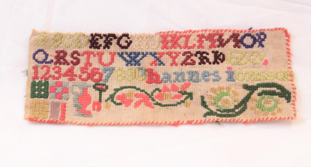 Stafaklútur. Saumaður af Hannesi Jónssyni, Stóra-Ási. Hannes fæddist 4.2.1883 og dó 16.5.1932.