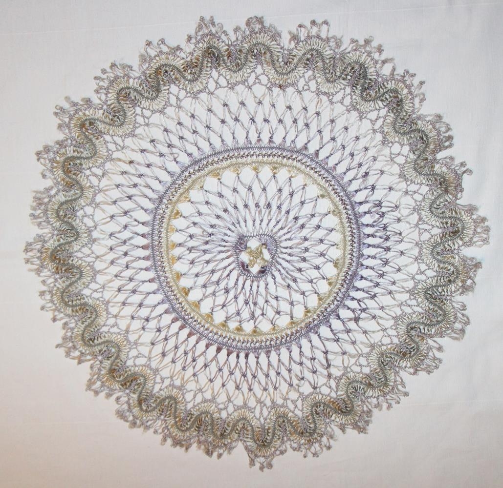 Gimbaður dúkur. Heklaður saman úr silkiþræði. Mjög fínn í fjólubláum, gráum og grænum litum. María Jónsdóttir heklaði hann. Dúkurinn er kringlóttur, þv. 43 cm.