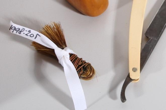 Rakbursti. Úr svínsburstum en það eru grófu hárin af trýni svínanna. Vafinn saman með koparvír. Lengd 6 cm. Notaður til að bera á sig raksápu á andlit, mýkist upp í heitu vatni. Eigandi og notandi var Sigurður Pétursson (1843-1029) bóndi á Hofsstöðum og gefandi er Birna Björnsdóttir Goðalandi 18, Reykjavík.