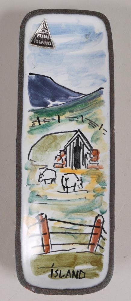 Minjagripur. Lítill platti ílangur með málaðri mynd af sveit. Myndin er merkt Ísland. Plattinn er stimplaður á bakhlið fyrir miðju. Límmiði frá Funa er límdur á framhlið platta.