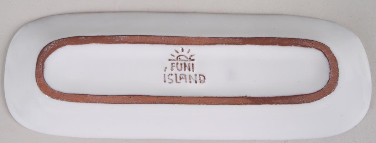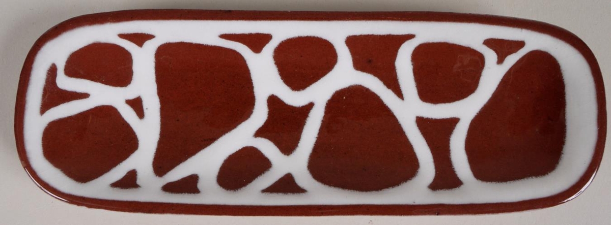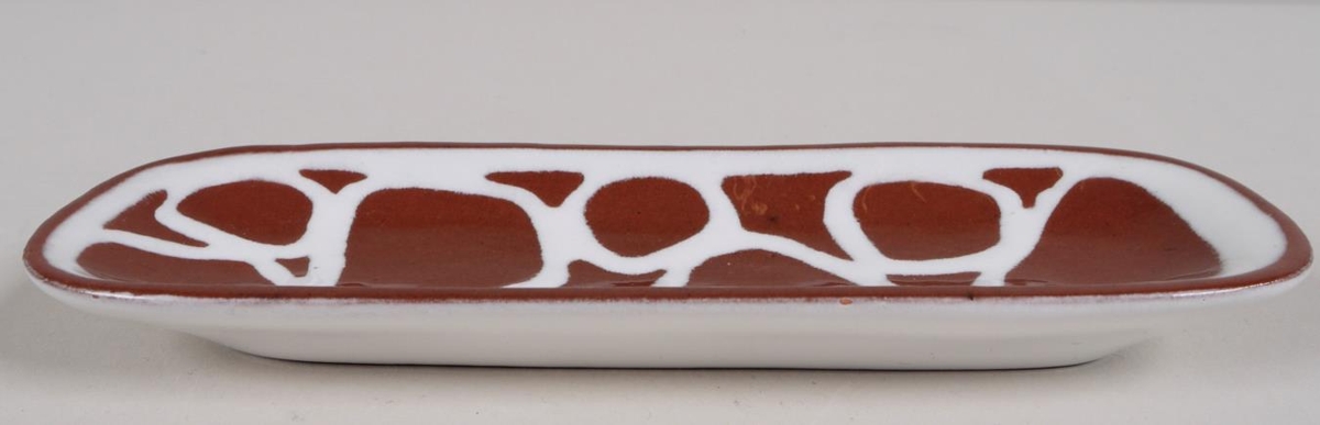Lítill ílangur diskur með sgraffito skreyti. Abstrakt mynstur. Brúnn og hvítur. Plattinn er stimplaður á bakhlið fyrir miðju.