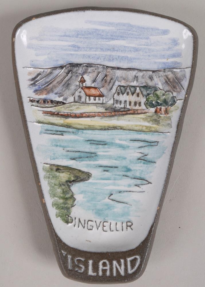 Minjagripur. Lítill platti ílangur með málaðri mynd frá Þingvöllum. Myndin er merkt Þingvöllum og Íslandi. Plattinn er stimplaður á bakhlið fyrir miðju.