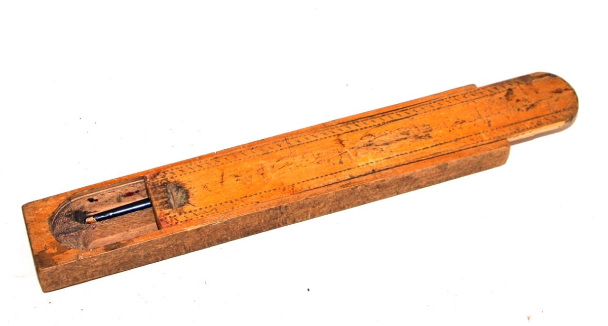 Pennastokkur úr viði. Í stokknum eru þrjú hólf og í þeim eru: Blekþurrka úr leðri 6 x 3,5 cm, sporöskjulaga með gati á öðrum endanum. Í öðru hólfi er pennastöng, rauð, hvít og blá og mjókkar í odd, framan á henni stendur: „1107 American Pencil CO. New York U.S.A.'' Lok stokksins er mynstrað til hliðanna en er farið að láta á sjá eins og stokkurinn allur.