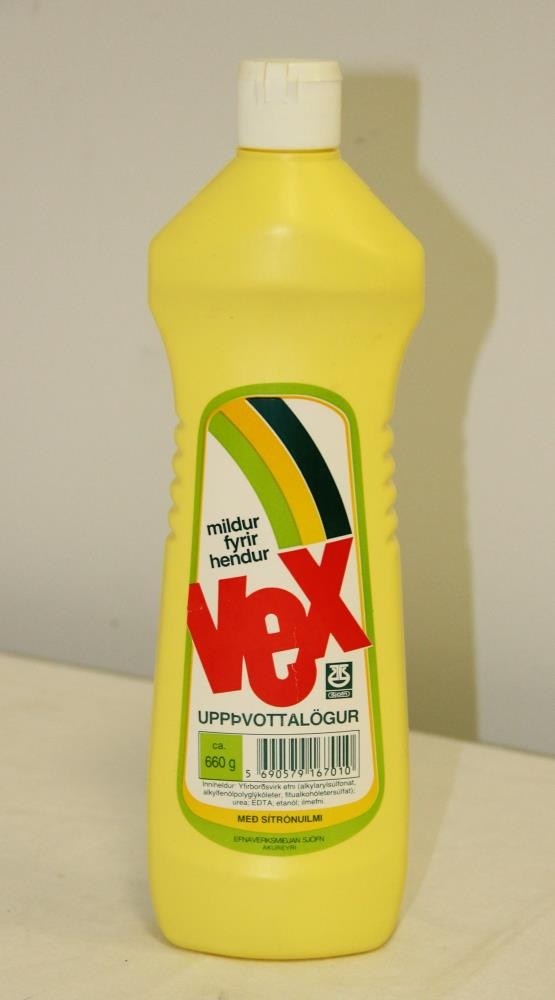 Gul plastflaska með hvítum tappa, smelluloki og sprautustút undir Vex uppþvottalög. Álímdur miði í mörgum litum. Áletrun: Mildur fyrir hendur - Vex, (í áberandi rauðum lit fyrir miðju), uppþvottalögur - Ca. 660g. - Innihaldslýsing - Með sítrónuilmi - Efnaverksmiðjan Sjöfn, Akureyri.