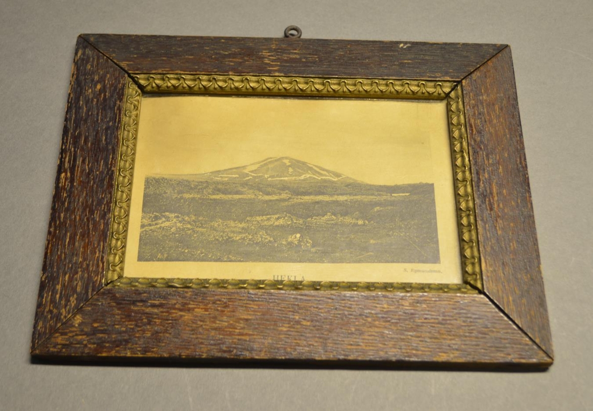 Mynd í litlum ramma sem er dökkur viðarrammi 24,5X19 cm. Myndefnið er Hekla sem er sv hvít ljósmynd úr dagblaði. Undir stendur HEKLA og til hliðar nafn ljósmyndara S. Eymundsson. Hringur er ofan á ramma til að hengja upp. Var í kassa innan í saumavélakassa nr. 3623. Saumavél og saumavélarskápur Sigríðar í Hellnatúni, móður Filippíu.