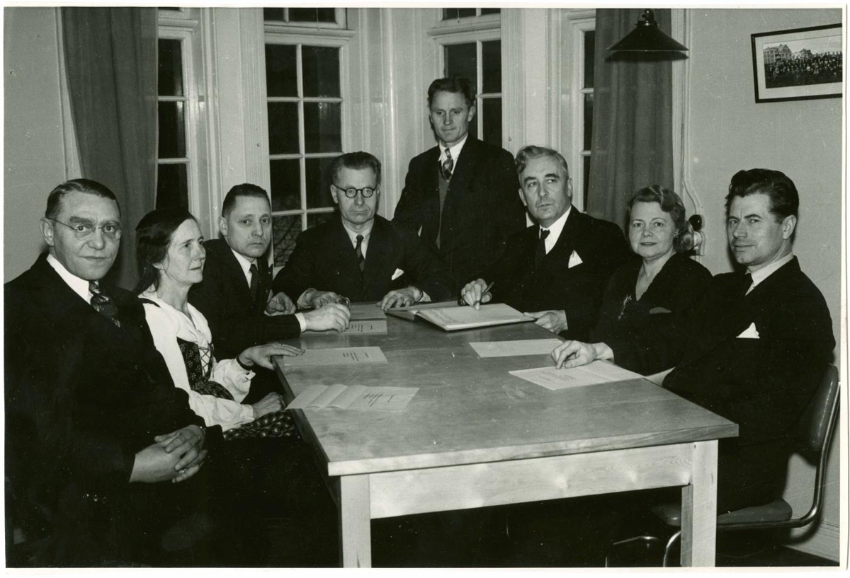 Nefnd með átta fulltrúum situr við fundarborð. Fundardagskrá útprentuð á borði og fundarritari, Árni Sigurðsson með penna í hönd. Óvíst hver nefndin er en líka á sviði fræðslumála í Reykjavík.
