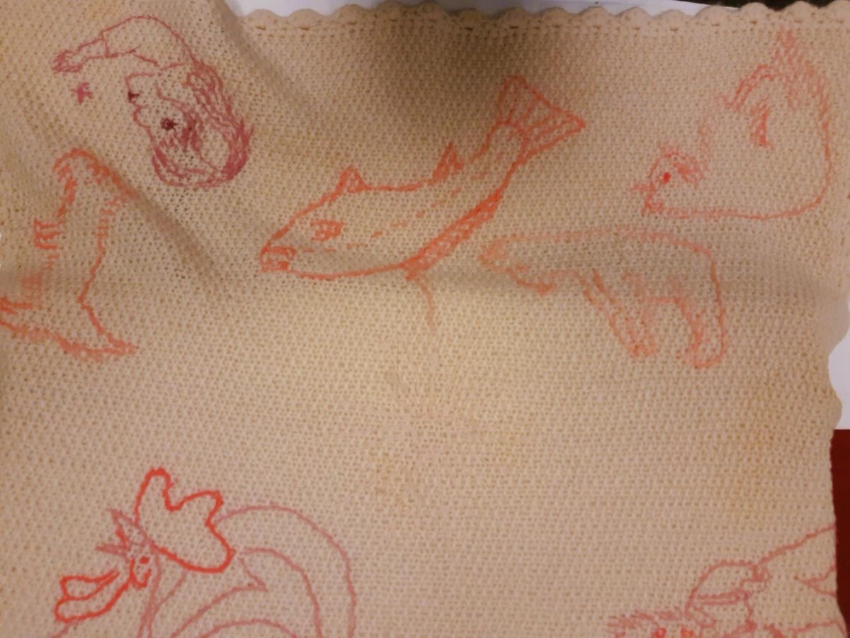 Barnarúmteppi prjónað með perluprjóni. Útsaumaðar myndir Í teppið s.s. konuandlit, hundur, fiskur, bangsi, hani, ofl. Í miðju sól. Hekluð lauf í kring.