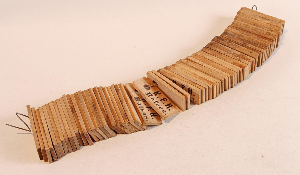 Sláturspjöld úr furu. 67 stk. Merkt K.F.H. Hofsósi. Kom úr Kaupfélagshúsinu á Sandi á Hofsósi þar sem Sláturhús Austur-Skagfirðinga var til húsa.