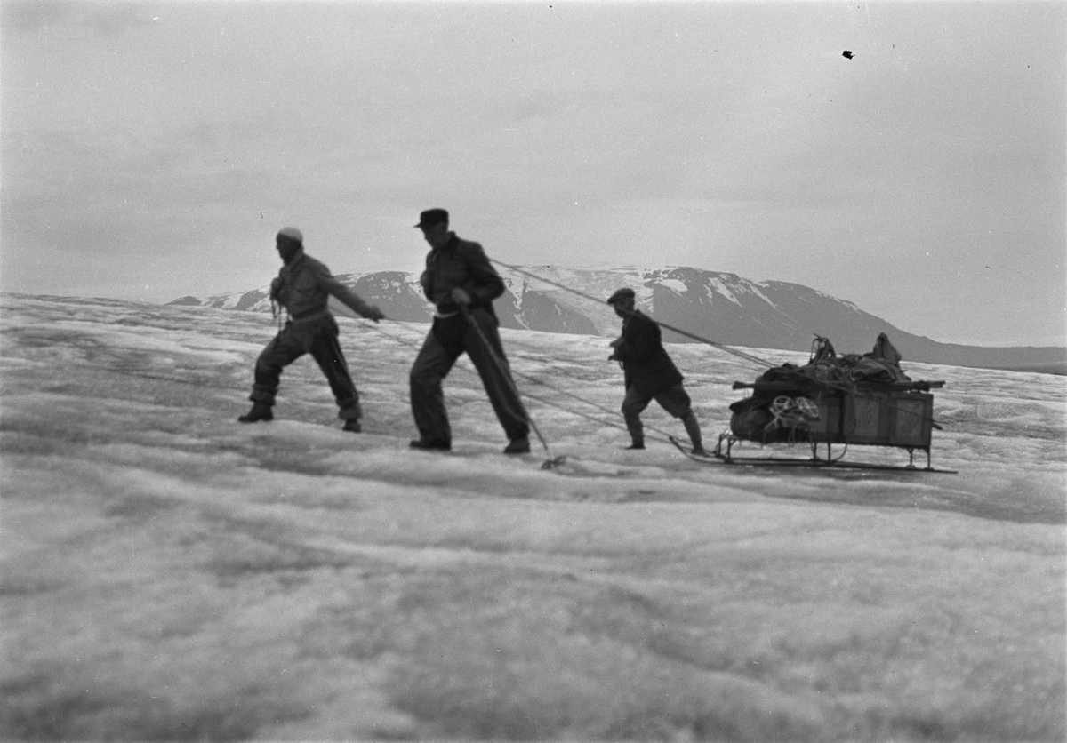 Frá ferð Kristjáns Ó. Skagfjörð og Guðmundar Sigmundssonar eftir endilöngum Langjökli. Þeir feðgar Jósep G. Elíesersson og Þorsteinn Jósepsson fluttu þá að norðvesturenda jökulsins. Þetta gerðis líklega 1934. Þrír menn draga sleða, gætu verið Guðmundur Sigmundsson, Kristján Ó Skagfjörð og Jósep G. Elíesersson. Eiríksjökull í baksýn.