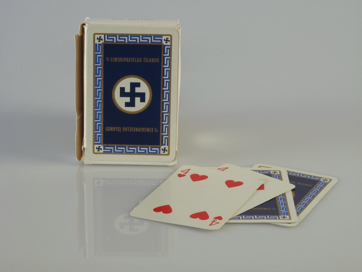 Spilastokkur, í hann vantar ekkert spil og einnig fylgja tveir jókerar. Þetta eru hefðbundin handspil. Á spilunum og kassanum um hann er gamla merki Eimskipafélagsins, á dökkbláum grunni, og fyrir ofan það og neðan stendur „H/F EIMSKIPAFJELAG ÍSLANDS“, með gylltum stöfum. Á hinni hlið kassans stendur „ALL BRITISH WADDINGTONS PLAYING CARDS“ og blómamunstur þar í kring. Á hliðum kassans stendur „JOHN WADDINGTON LIMITED. Licensed Playing Card Manufacturers:: LEEDS LONDON.“ Og „ALL BRITISH“. Önnur hlið kassans er farin að losna.