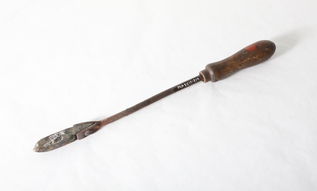 Lóðbolti, 34,5 cm að lengd. Með renndu, 11,5 cm löngu tréhandfangi. Á handfanginu er rauð máningarsletta. Haus lóðboltans er beint út frá skafti. Stærð hauss: 7,5 x 1 x 1 cm. Á hausnum eru leyfar af tini sem notað var til að lóða með.