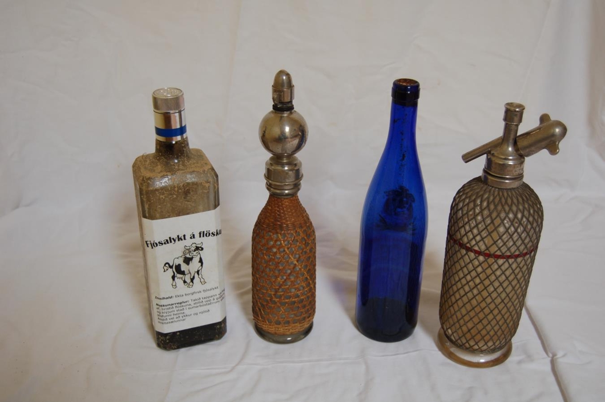 Gamlar flöskur sem Þorkell Fjeldsted og Heba Magnúsdóttir fylltu á "fjósalykt" og leyfðu gestum Laxveiðisafnsins í Ferjukoti að finna í heimsókn sinni.