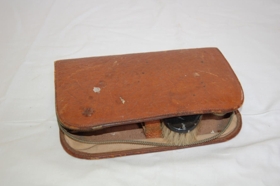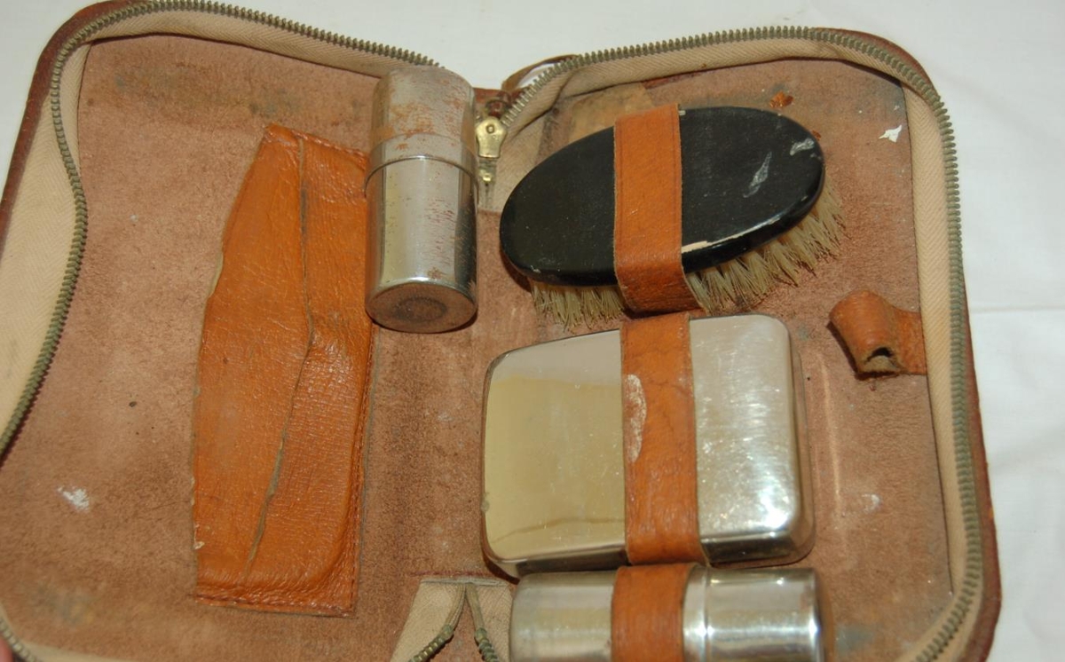 Taska með áhöld til skeggraksturs. Rakbursti og einhvers konar hylki undir til dæmis sápu og annað. Var áður í eigu breskra veiðimanna sem stunduðu veiðar í Grímsá á árunum 1900-1970.