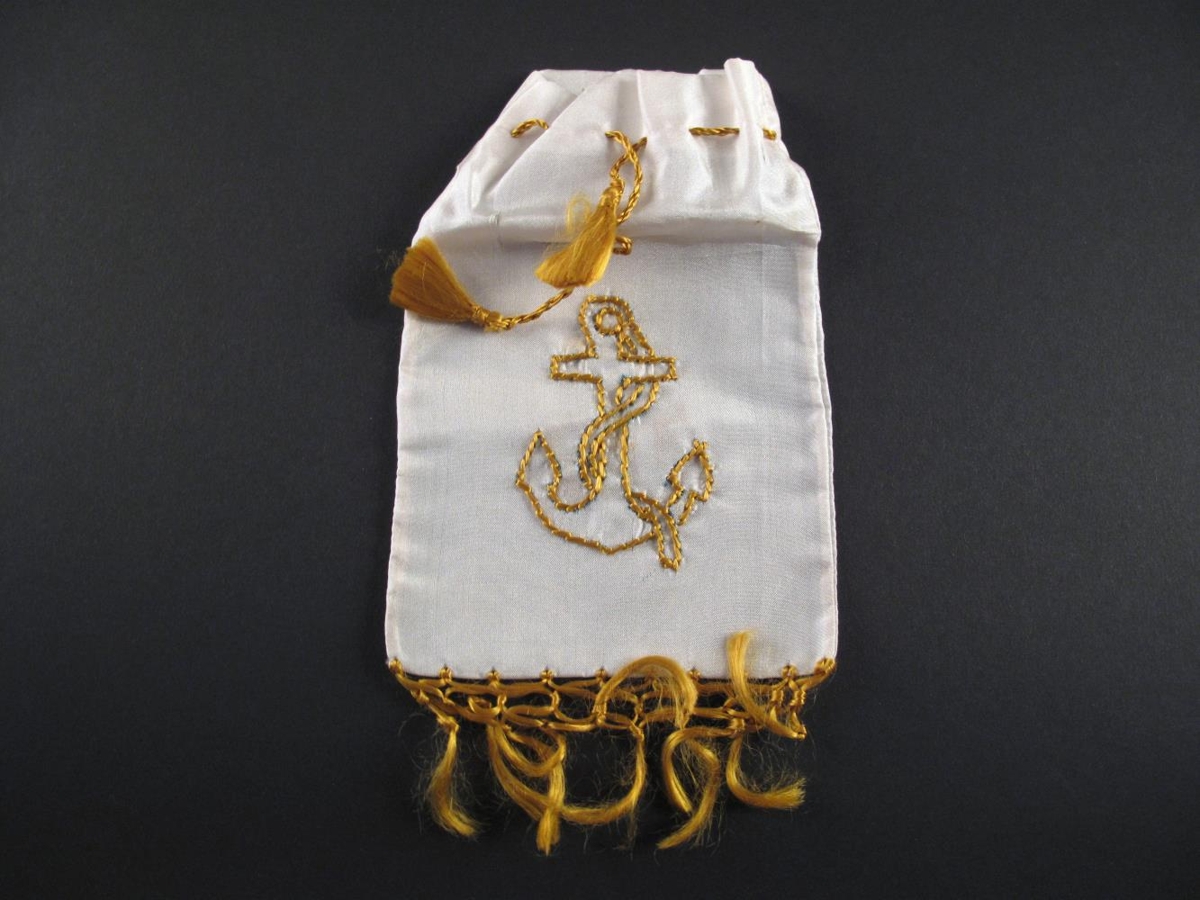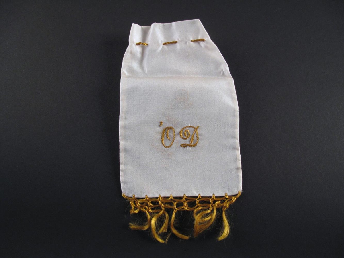 Öskupoki, vélsaumaður úr hvítu silki en útsaumaður í höndum. Faldaður að ofan. Í aðra hlið pokans er saumað fangamarkið „ÓD“ (þ.e. fangamark þess er átti, Ólafs Daníelssonar). Í hina hliðina er útsaumuð mynd af akkeri með taug í sem hringar sig í kringum akkerið. Hægt er að sjá pennastrikin sem teiknuð voru á pokann og saumað eftir. Allur útsaumur er með gylltum silki- eða satínþræði. Pokanum er rykkt saman að ofanverðu með snúinni snúru úr sams konar gylltum þræði. Snúran er svo þrædd í gegnum efnið með jöfnu millibili allan hringinn og festir um leið niður faldinn. Á endum snúrunnar eru dúskar/skúfar úr sama þræði. Sams konar þráður er jafnframt notaður í kögur, með eins konar möskvum, sem fest er enðst á pokann.