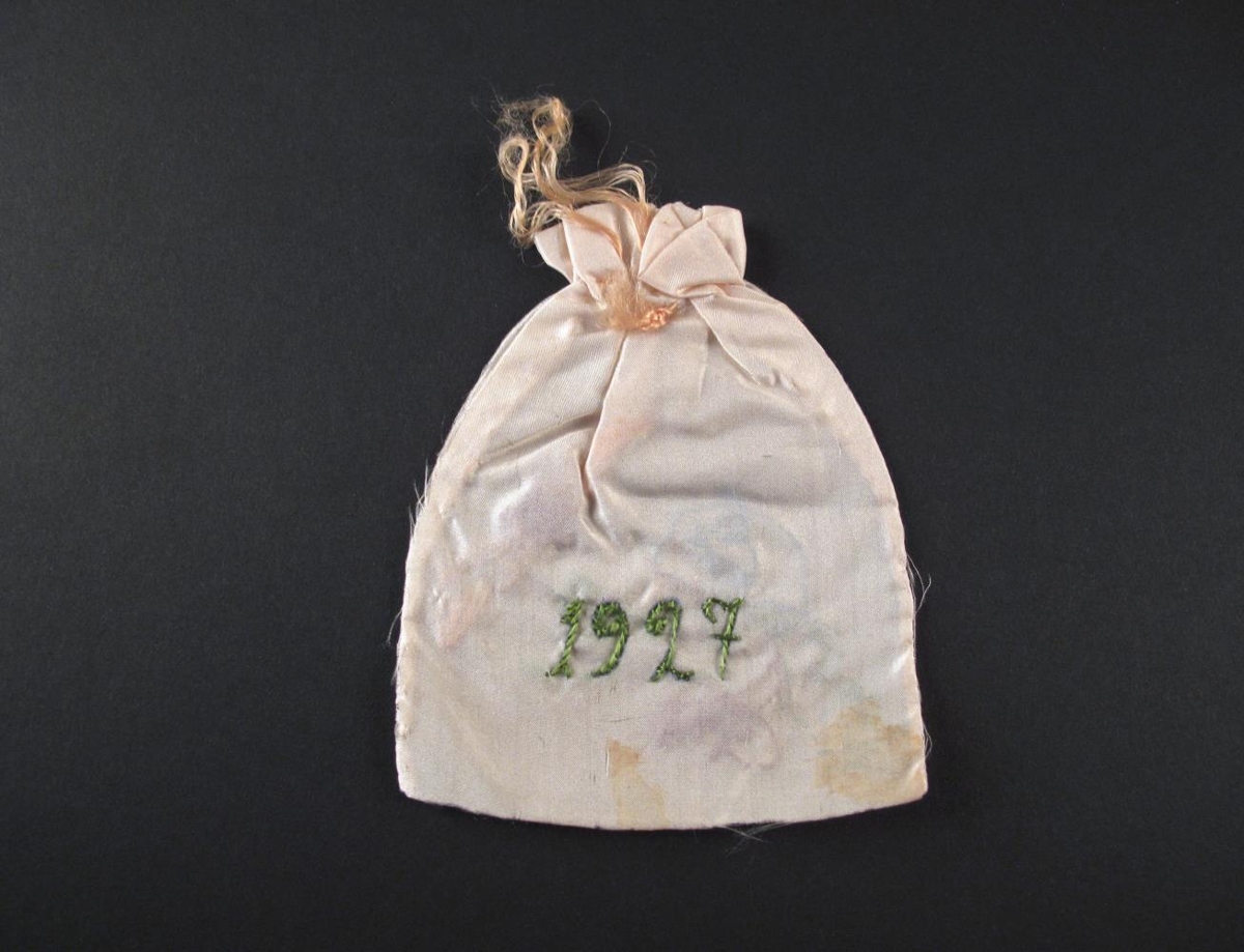 Öskupoki, vélsaumaður úr hvítu silki. Faldaður efst. Á framhlið eru handsaumaðar myndir. Annars vegar af konu með bláa skuplu eða húfu á höfði og með rauðan klút um hálsinn. Hins vegar af rauðu hjarta, fljúgandi fölbleikum vængjum. Á bakhliðinni er handsaumað ártalið „1927“ með dökkgrænum þræði. Faldurinn við opið efst er þræddur niður með einföldum, fölbleikum þræði sem jafnframt er notaður til að rykkja opinu saman. Nokkuð er farið að sjá á pokanum. Nokkrir blettir eru í honum og silkiefnið farið að trosna á nokkrum stöðum.