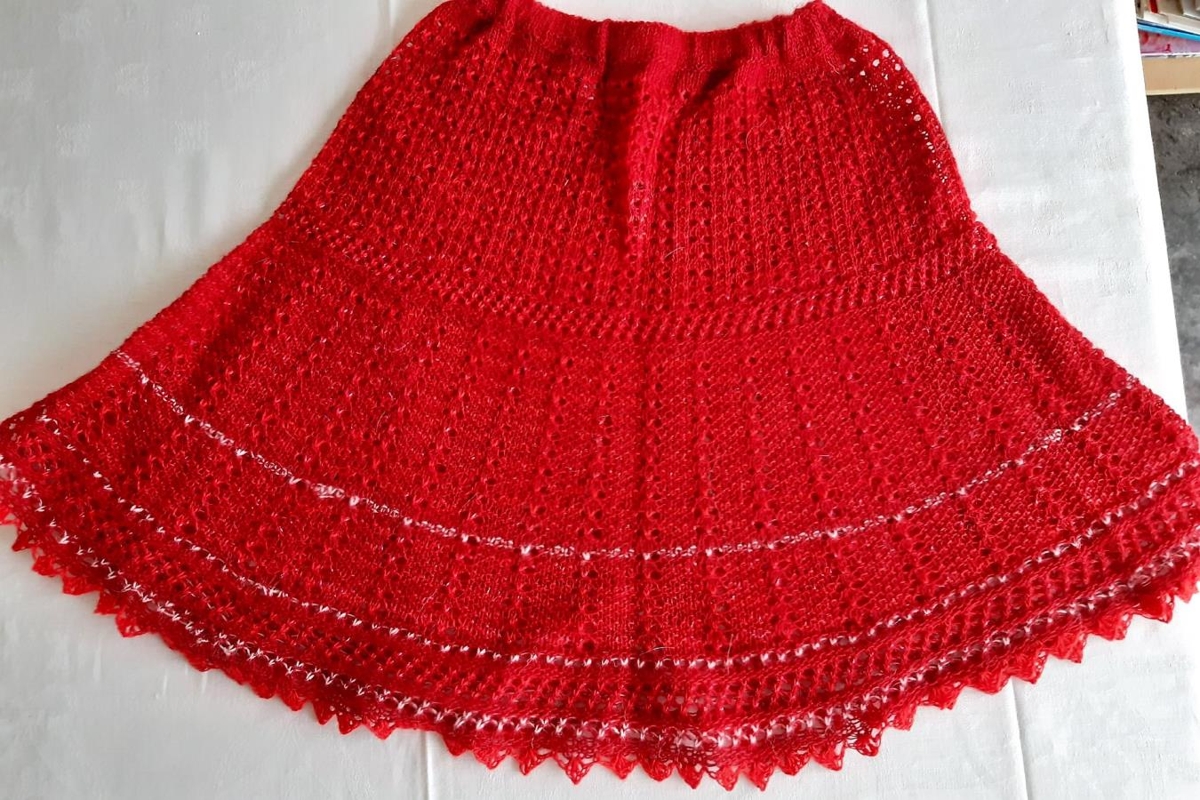Pilsið er aðallega prjónað með garða- og gataprjóni. Það er rauðbleikt að lit með þremur hvítum röndum neðarlega á pilsinu. Laufahekl neðst í faldbrún.