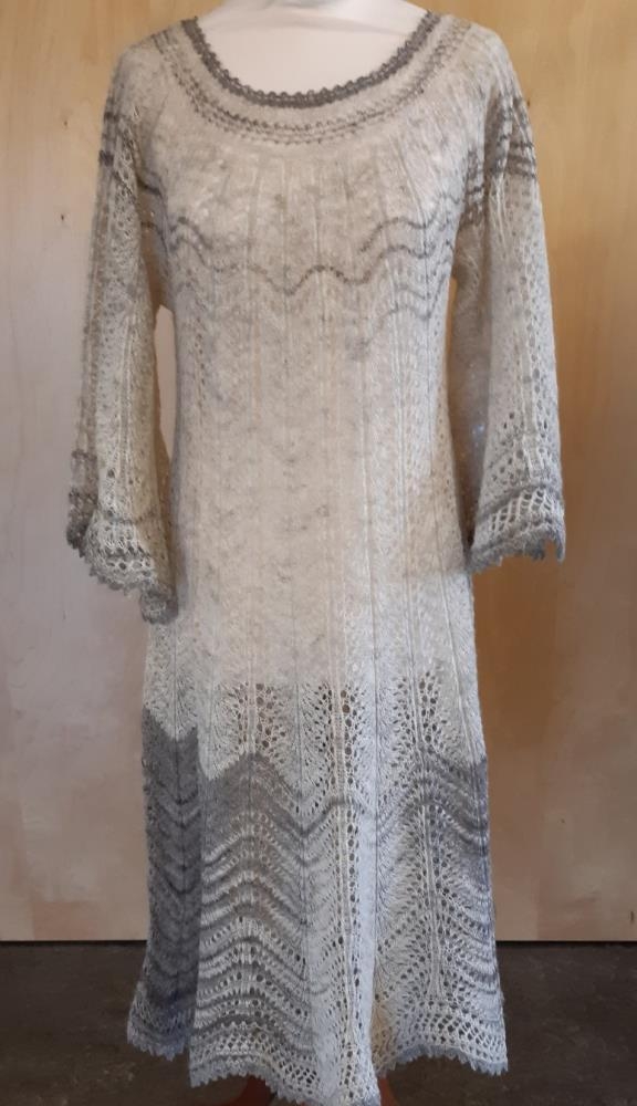 Aðallitur kjólsins er ljósgrár en dekkri renndur í hálsmáli og yfir brjóst. Einnig framan til á ermum sem eru frá hálsmáli 52 cm. að lengd en víkka vel út neðst. Neðri hluti kjólsins er ljósgrár fyrir miðju en dekkri litir til hliðanna. Kjóllinn er prjónaður með svokölluðu krónuprjóni.