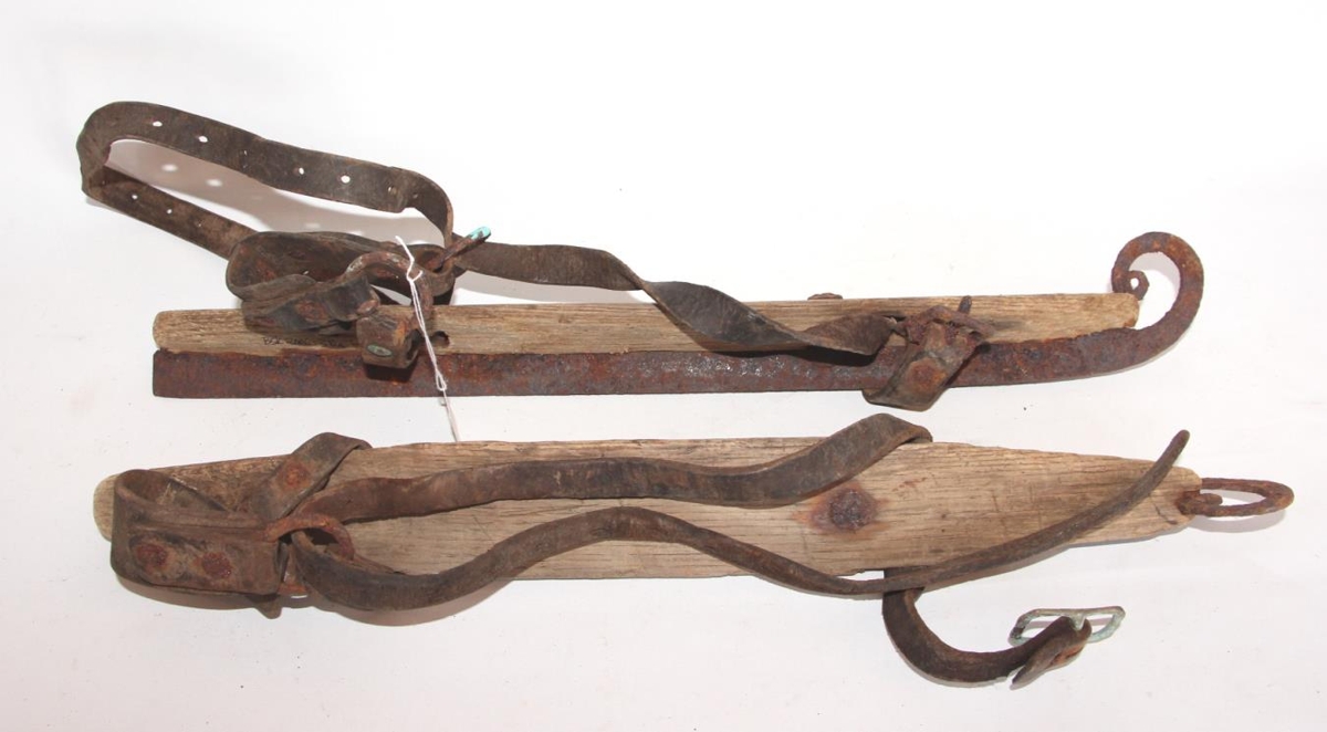Skautar úr járni, furu og leðri, samskonar langhlauparar og nr. 2006-37. Lengd 46 cm. Þeir eru alveg eins að öðru leiti en því að í stað málmskífu á fæti (sóla), til að vinda leðurólarnar, eru göt fyrir ólarnar bæði á hæl og tá. Járnið sem er fellt inn í rauf á trénu er einnig boltað á tréð með járnfestingum sem rekin eru niður í gegn um tréð á tveimur stöðum og járnið fest í milli. Þá er járnið eldsmíðað en ekki klippt til úr járnþynnu eins og hitt. Er járnið teygt upp á tá og hringað í laglega lykkju.