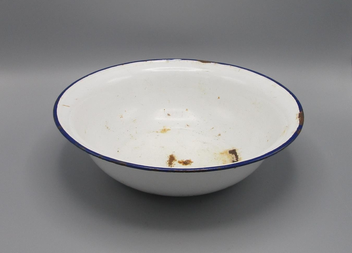 Vaskafat, hvít emelerað með blárri rönd, nokkuð skellótt og ryðgað. Úr eigu Ástu Gestsdóttur móður gefanda.