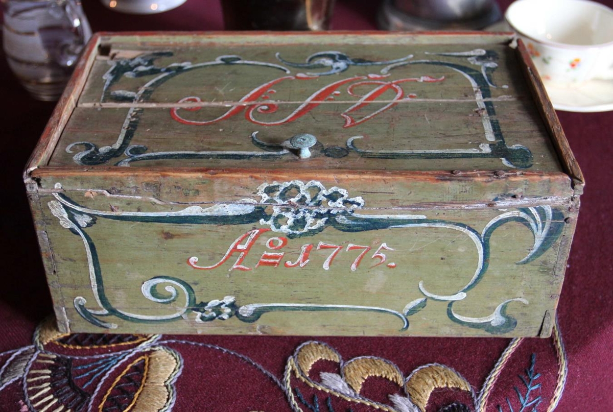 Stokkurinn er málaður ljósgrænn og á hliðum, göflum og loki er eins konar „rósamálning“, sveigar og strik með grænum og hvítum lit. Ofan á lokið er málað með rauðu og hvítu fangamarkið IID og á framhlið með sömu litum Anno 1775. Stokkurinn er prýðisvel gerður og ber hann allur glögg einkenni málarans, sem er Jón Hallgrímsson í Kasthvammi í Þingeyjarsýslu (f. 1739, d. 1808).