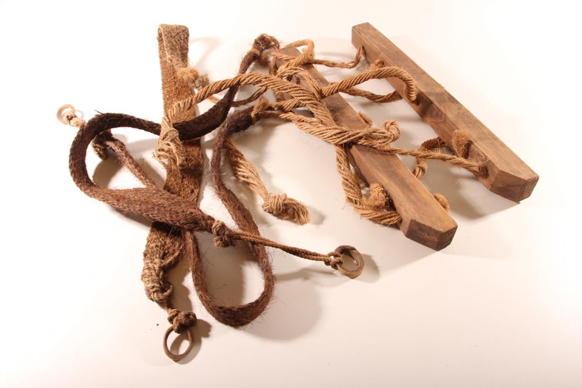 Í mið- og endagötin ganga gagntök og móttök, og er sá útbúnaður alveg eins og á klyfberum. Gjarðirnar eru brugðnar úr brúnu hrosshári og hringjur úr horni, kringlóttar. Upp úr hvorri fjöl eiga að vera þrír stuttir járntittir til að skorða líkkistuna, en hún var reidd um þverbak og stutt við endann. (Sjá mynd í Ísl. þjóðháttum, 1934, bls. 303). Járntitti þessa vantar.