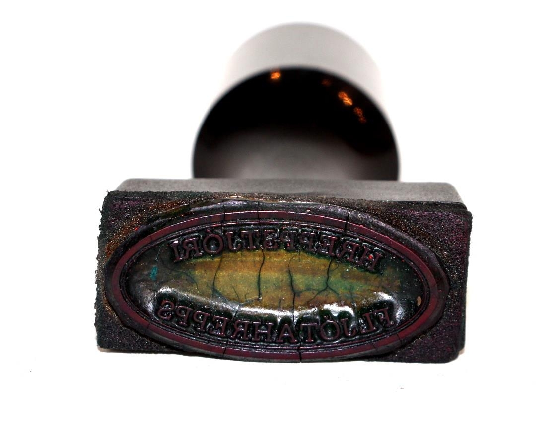 Stimpill frá hreppsstjóra Fljótahrepps. Úr gúmmí, límdur á plasthaus með plasthaldi. Sundurlaus. Stéttin er 4,5 cm að lengd og breiddin er 2 cm. Lengd halds alls 7,5 cm.