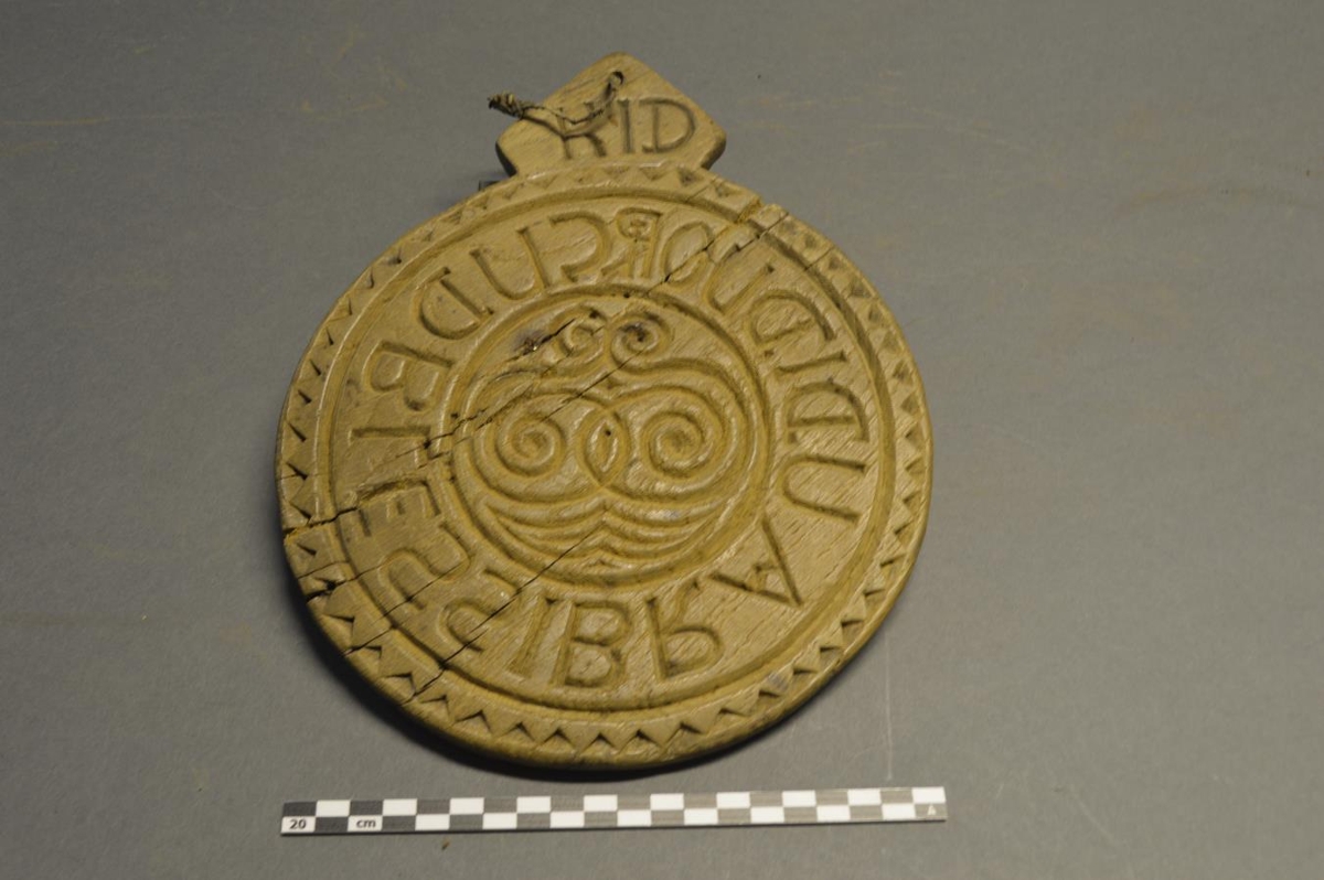 Brauðmót sem á stendur KID og VOR GUÐ BLESSI BRAUÐIÐ. Kom frá Hörgsdal í Mývatnssveit. Er nokkuð sprungið og hefur verið límt saman á einum stað.