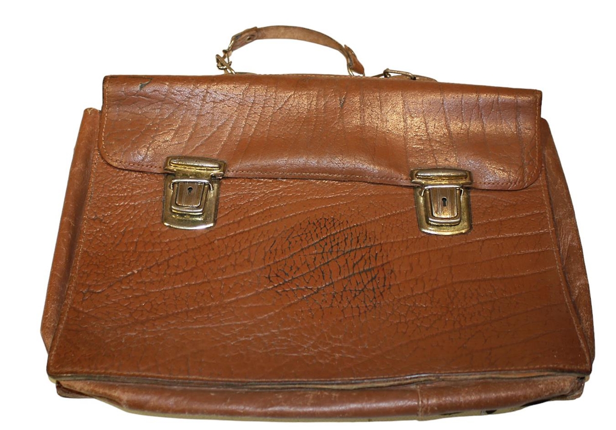 Brún leðurskólataska með haldfangi, tvær festingar fyrir hliðarólar (en ólarnar vantar). Kemur úr dánarbúi Snjólaugs Þorkelssonar (1932-2016) og Jónínu Bjargar Halldórsdóttur (1933-2016) en líklega er börn þeirra hafi notað í sinni skólagöngu