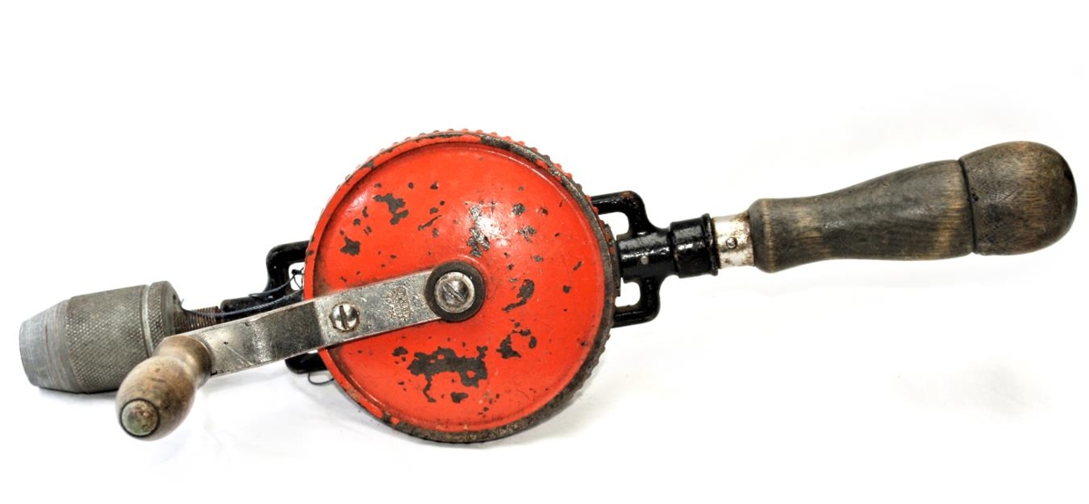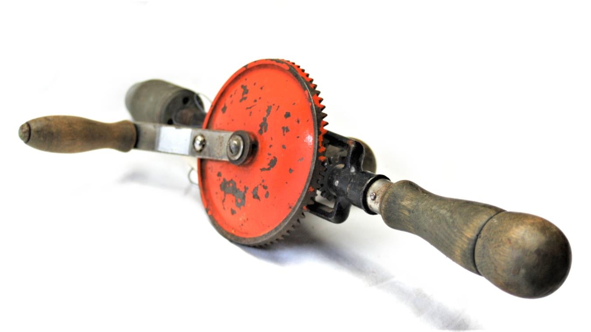 Handbor úr tré. Á handsveif er ristað eftirfarandi: Stanley No 624 (Egg beater hand drill) Bor gerður úr járni. Rauðmálað skífa. Handborinn tilheyrir verkfærakistu Snorra Mikaelssonar.