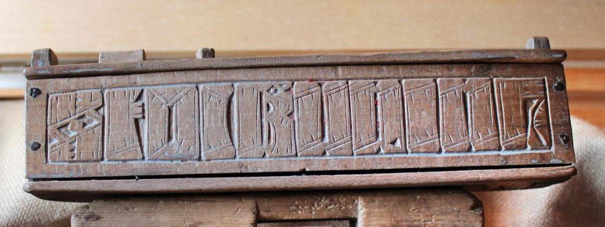 Ofan á lokið eru skorin laufblöð, smákringlur og tíglabekkir, og á gafla tíglaskraut.