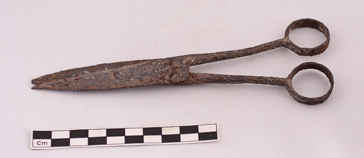 Skæri úr járni, með venjulegu skæralagi. Lengd 17,2 cm. Stafurinn P er stimplaður við þolinmóðinn og skærin því líklegast erlend þótt í frumskrá séu þau talin íslensk smíð. Þau eru allmjög ryðbrunnin og brotið framan af öðrum oddinum, en eru enn liðug um þolinmóðinn.