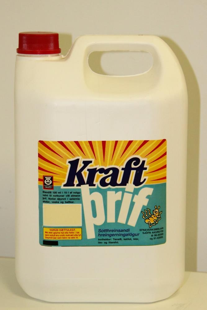 Hvítur plastbrúsi með haldi og rauðum tappa. Áletrun á álímdum miða í mörgum litum: Kraftþrif - Sótthreinsandi hreingerningarlögur - Notkunarreglur, varúðarorð og innihaldslýsing - Notist til hreingerninga á hreinlætistækjum.