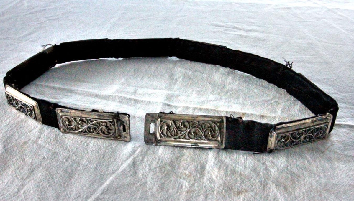 Beltið er stokkabelti. Stokkarnir eru úr silfri, 10 að tölu, 2,2 cm x 5 cm og saumaðir á svart flauel, og er nokkurt bil á milli þeirra. Þeir eru smíðaðir, og á þeim víravirkissveigar. Í miðju er kringlóttur silfurskjöldur, 4,4 cm í þvm. og með víravirki í sama stíl og stokkarnir. Beltið er vel smíðað, en engin stimpill er sjáanlegur á því. Það er saumað fast við treyjuna.