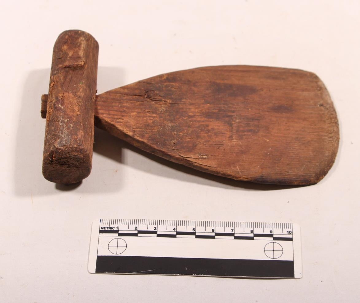 Taðspaði úr furu, með sívölu þverhandfangi (þverkefli). Stærð 8,5 x 16,5 cm.