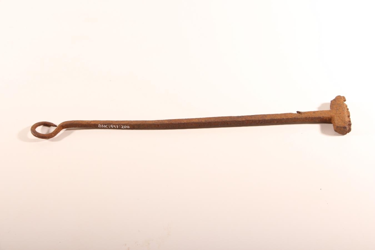 Brennijárn úr járni, með ferköntuðum haus og járnteini með mjórri lykkju á enda (til að hengja upp á). Lengd alls 36,3 cm. Hausinn er 5,2 cm. breiður. Á honum eru stafirnir Gunnþ.